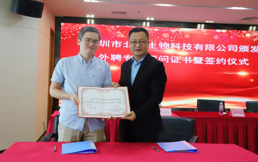 9月29日下午,為推動(dòng)公司實(shí)現(xiàn)高質(zhì)量的發(fā)展,提升公司的核心競(jìng)爭(zhēng)力,深圳市北科生物科技有限公司舉行了頒發(fā)外聘專家顧問證書暨合作項(xiàng)目簽約儀式。北科生物董事長(zhǎng)胡雋源博士與蔣衛(wèi)教授簽訂《合作項(xiàng)目意向書》并頒發(fā)