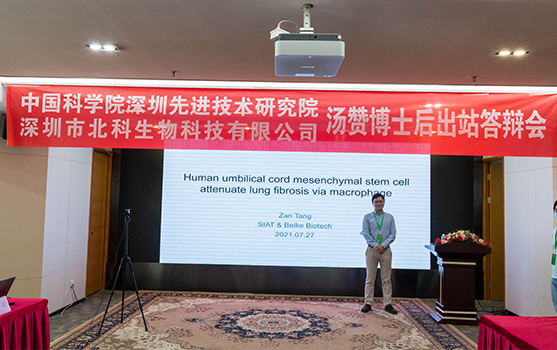 7月27日,由中國(guó)科學(xué)院深圳先進(jìn)技術(shù)研究院與深圳市北科生物科技有限公司聯(lián)合培養(yǎng)的博士后湯贊博士出站答辯會(huì)在北科大廈舉行。答辯會(huì)上,湯贊博士匯報(bào)了題為《臍帶間充質(zhì)干細(xì)胞通過巨噬細(xì)胞緩解肺纖維化》的出站答