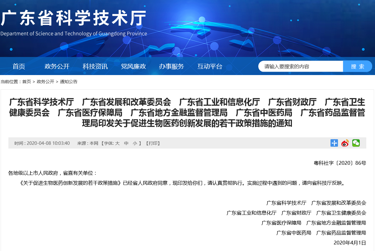 2020年4月8日,廣東省科學技術(shù)廳、廣東省發(fā)展和改革委員會、廣東省工業(yè)和信息化廳、廣東省財政廳、廣東省衛(wèi)生健康委員會、廣東省醫(yī)療保障局、廣東省地方金融監(jiān)督管理局、廣東省中醫(yī)藥局、廣東省藥品監(jiān)督管理局