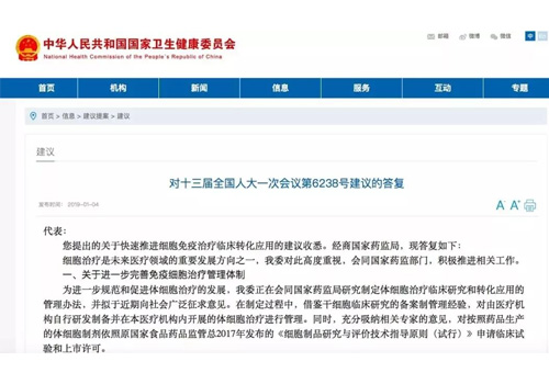 編者按:近日,國家衛(wèi)生健康委員會對十三屆全國人大一次會議第6238號建議給出答復。答復稱,國家衛(wèi)健委將會同藥監(jiān)部門,積極推進細胞治療的相關工作。答復中還提到,“近期10余個細胞治療產(chǎn)品即將獲批開展臨床