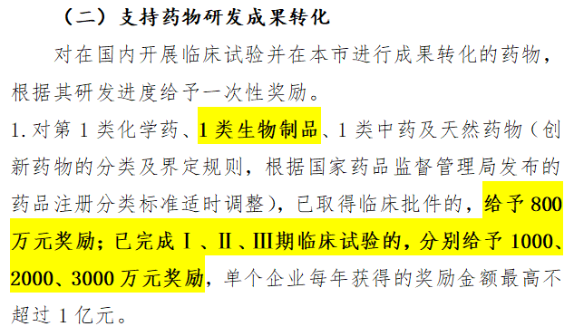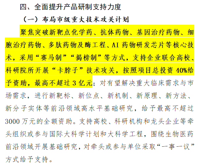 聚焦突破新靶點化學藥、抗體藥物、基因治療藥物、細胞治療藥物、多肽藥物及酶工程、AI藥物研發(fā)芯片等核心技術(shù),采用“賽馬制”“揭榜制”等方式,支持企業(yè)聯(lián)合高校、科研院所開展“卡脖子”技術(shù)攻關(guān),按照項目總投資40%給予資助,最高不超過3億元。