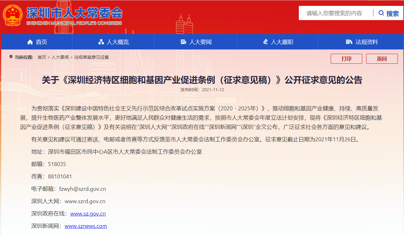 2021年11月12日,深圳新興領(lǐng)域重要立法《深圳經(jīng)濟(jì)特區(qū)細(xì)胞和基因產(chǎn)業(yè)促進(jìn)條例(征求意見稿)》在深圳市人大常委會網(wǎng)站上公開征求意見。