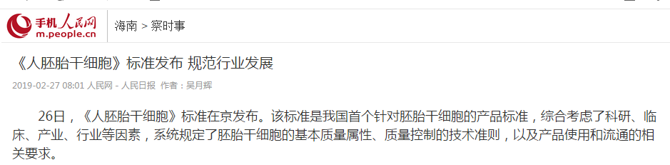 2019年2月26日,《人胚胎干細胞》標準在京發(fā)布。該標準是我國首個針對胚胎干細胞的產(chǎn)品標準,綜合考慮了科研、臨床、產(chǎn)業(yè)、行業(yè)等因素,系統(tǒng)規(guī)定了胚胎干細胞的基本質量屬性、質量控制的技術準則,以及產(chǎn)品使用和流通的相關要求。